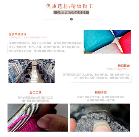 杰丰毛织制衣厂坐落于广东省东莞市大朗镇,是一家集设计、开发、生产、销售于一体的企业,主要经营生产和销售各种毛织时装产品。公司有10年毛织行业经验,设备齐全,拥有20台电脑横机,缝盘24台及其他配套设备,年产量达数60万件,产品主要销国内外市场。专业承接各类针织毛衣订单,订单出口,杰丰毛织制衣厂经销的针织衫、毛衣、羊毛衫品种齐全、价格合理。重信用、守合同、保证产品质量,以多品种经营特色和薄利多销的原则,赢得了广大客户的信任。诚邀全国各地的批发商一起合作。大家互惠互利。共同发展!!!!